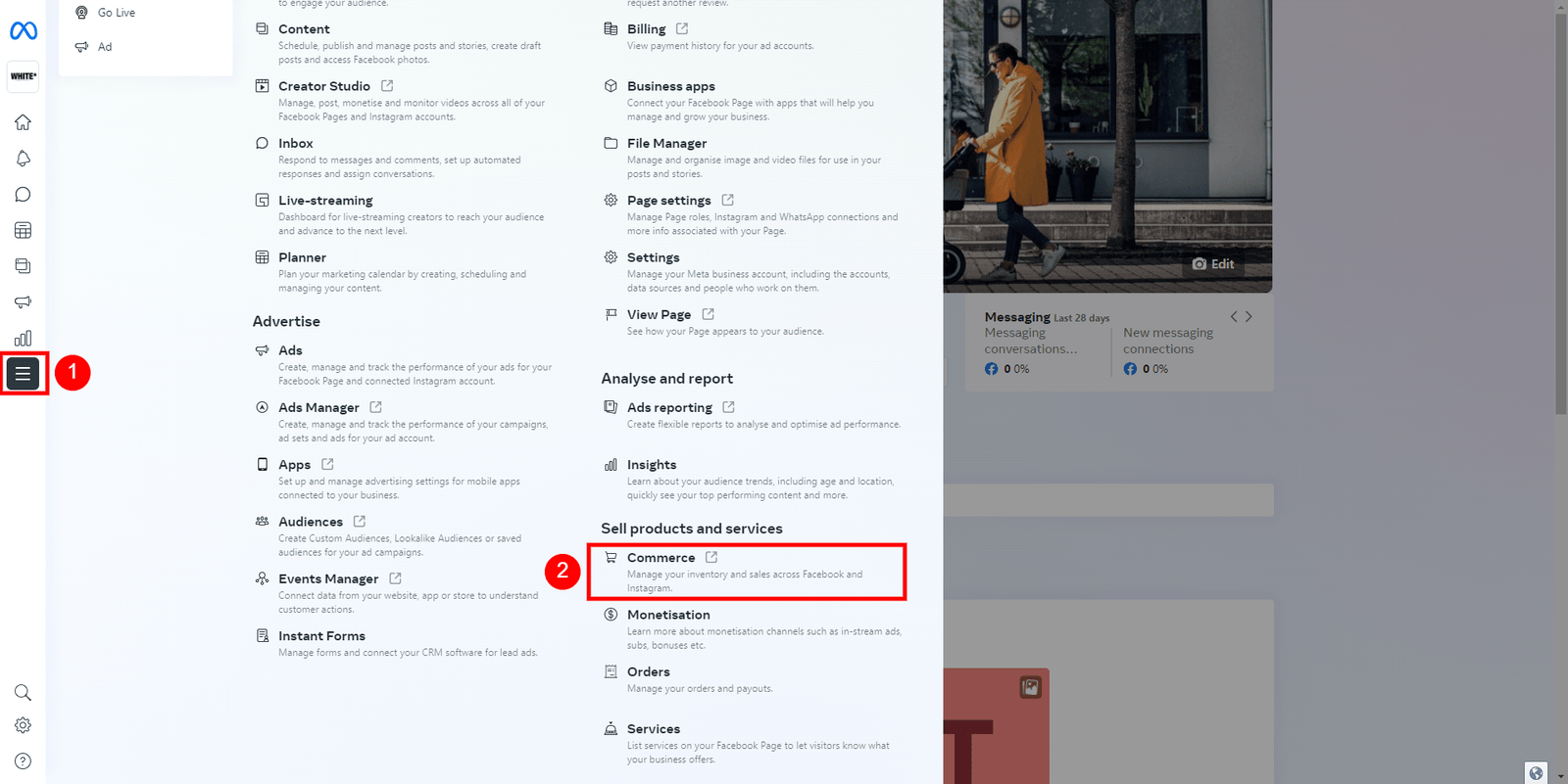 - At first, go to the business.facebook.com, then from the all tools menu go to commerce.