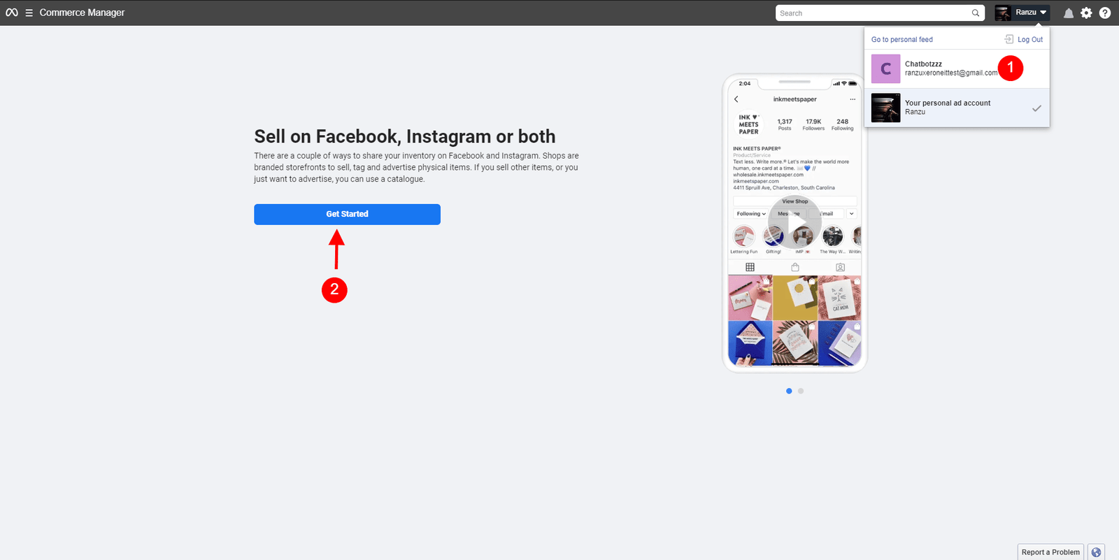 - From the top right corner click on the profile and select your business account. Then click on the Get Started button.