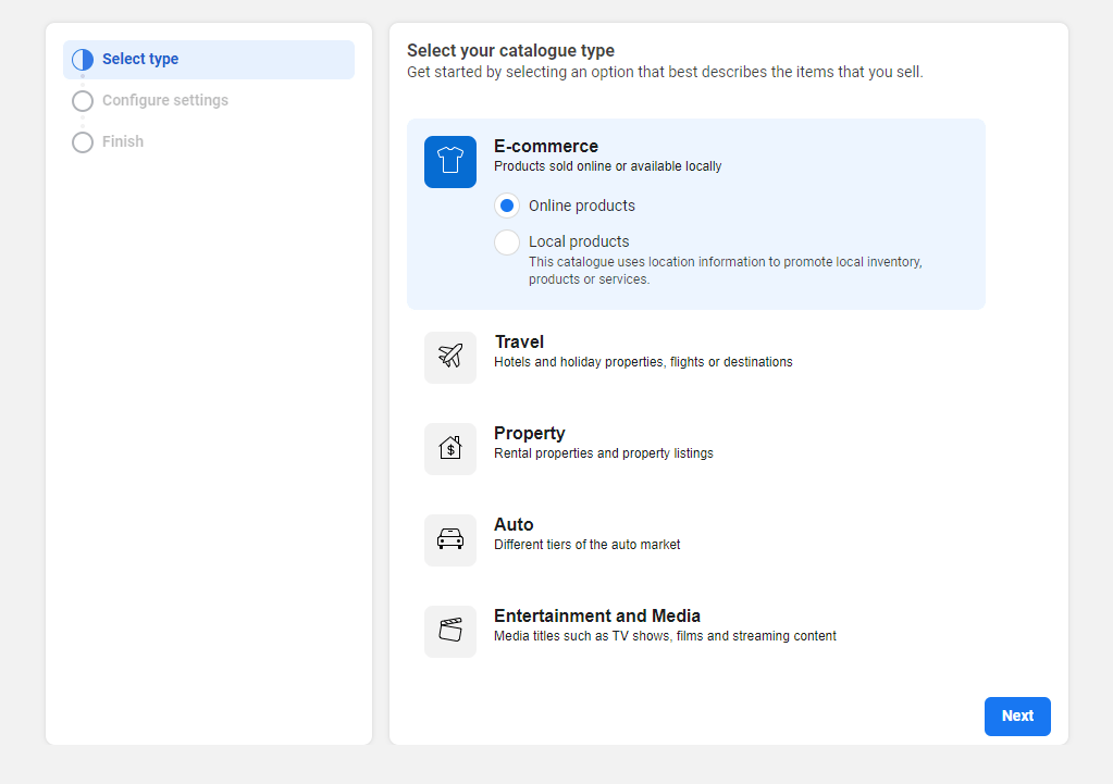 - On the next page just select the option to create a catalog and then click on the get started button again. Then select ecommerce and select the product types whether they are online products or local products. Then click on the next button.