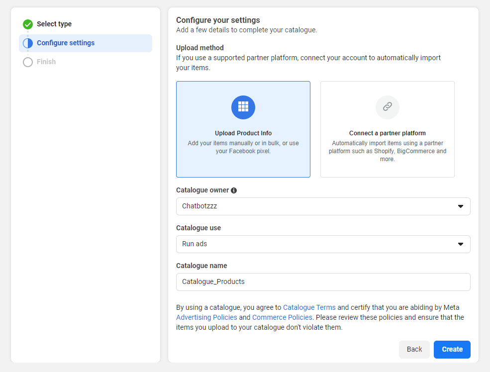 - You have to select an upload method. There are two types of upload methods. One is to upload manually and the other one is by connecting partner platforms like Shopify and BigCommerce. Then select the catalog owner, it’s actually the business that you have with Facebook. Then there is catalog use and catalog name. You need to provide a catalog name here.