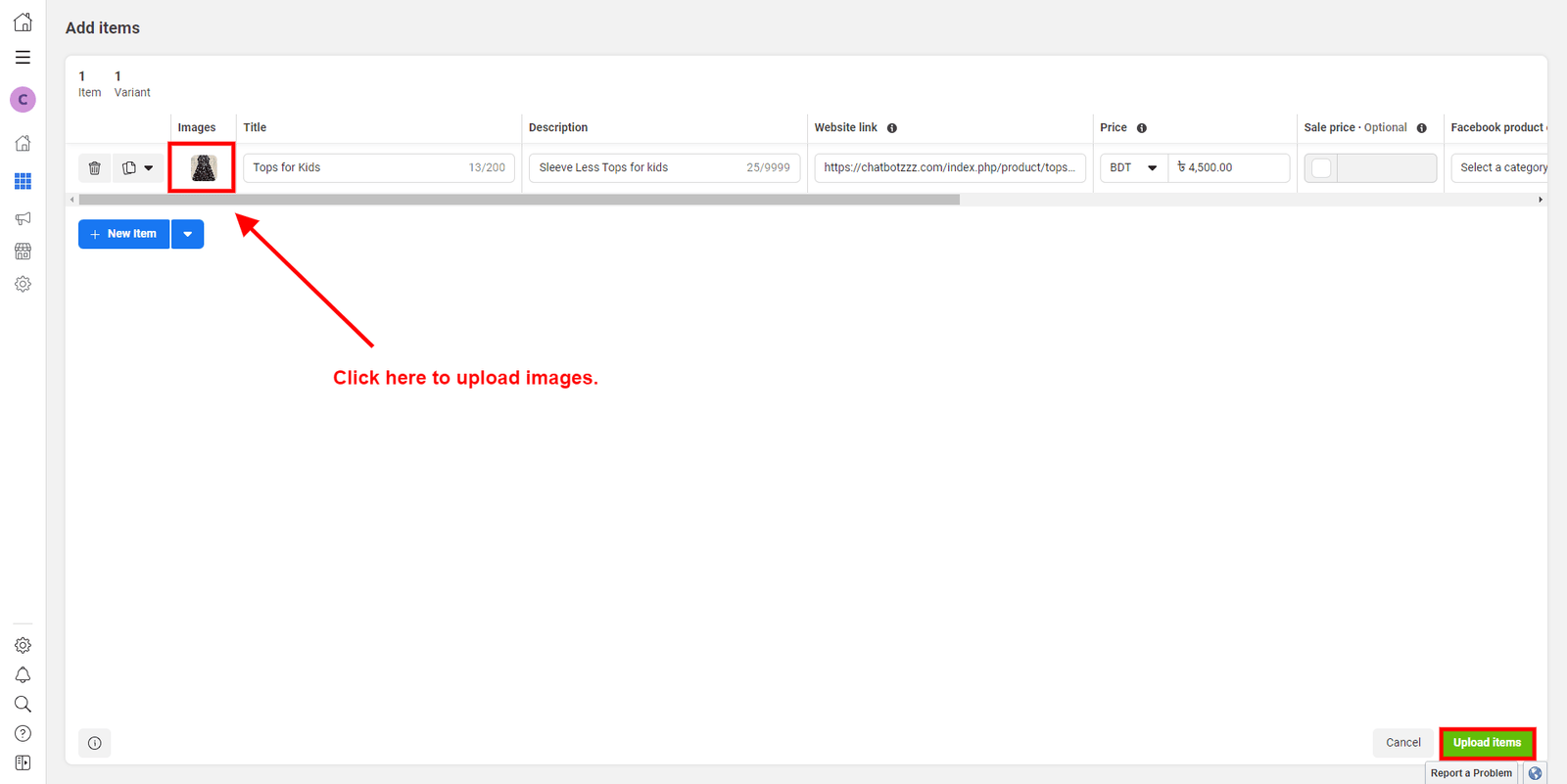 - After creating the catalog click on the view catalog. Then click on the add items button to add products. Then select Manual to upload the product manually. We need to upload images, titles, and descriptions of the product. Finally, click on the upload items button. You can add as many products as you want.