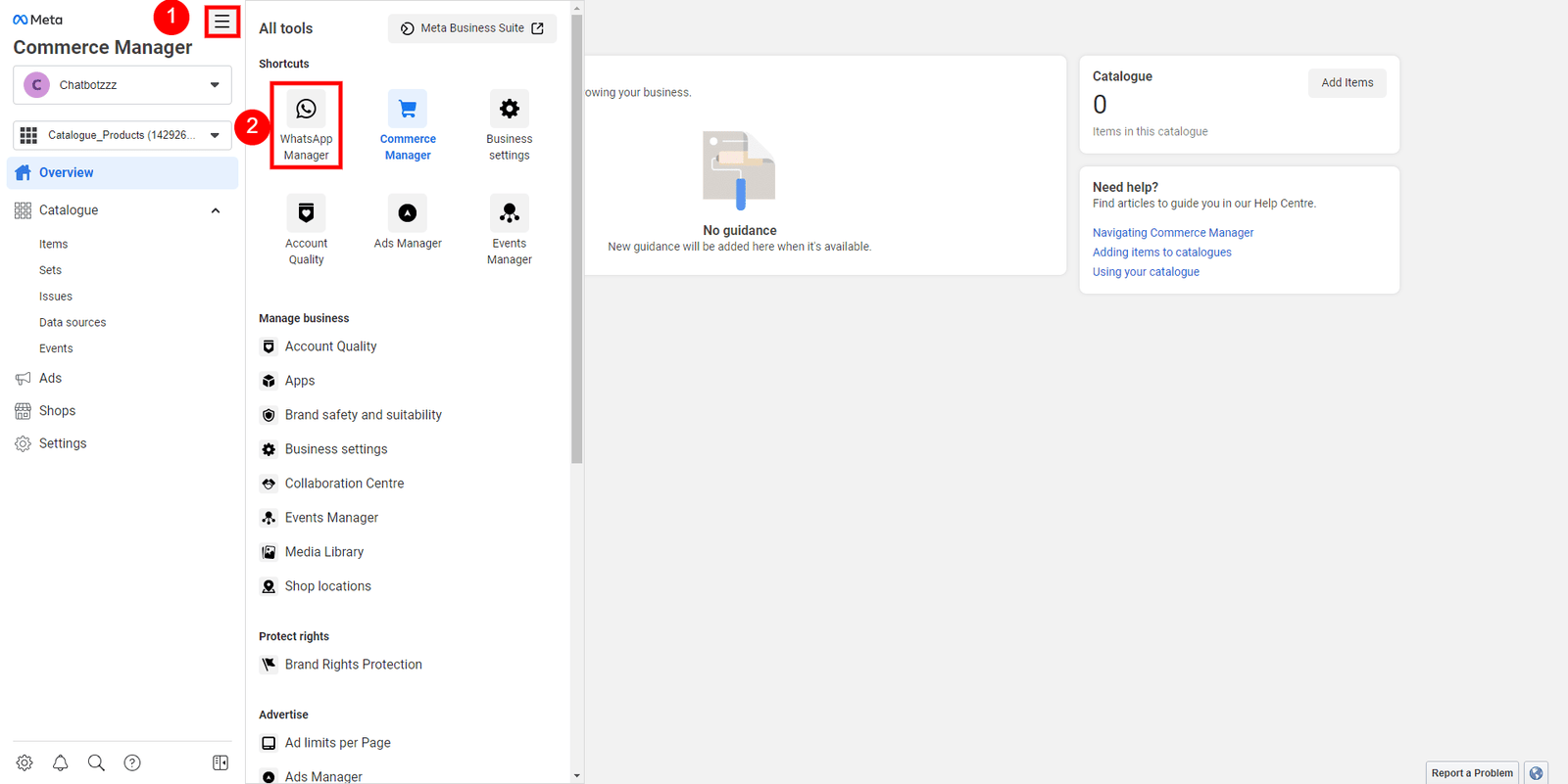 After creating the catalog in the commerce manager, you have to add the catalog to the WhatsApp cloud API. To do that, first click on the All Tools menu and select WhatsApp Manager.