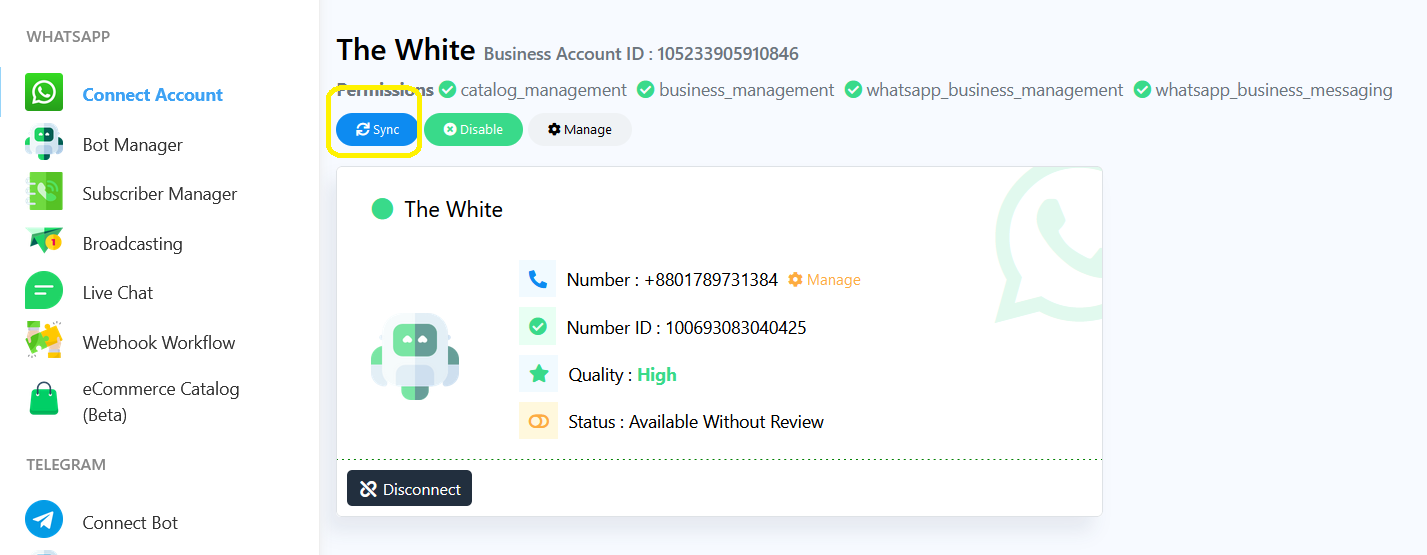 - Click on the Sync button under WhatsApp Number.